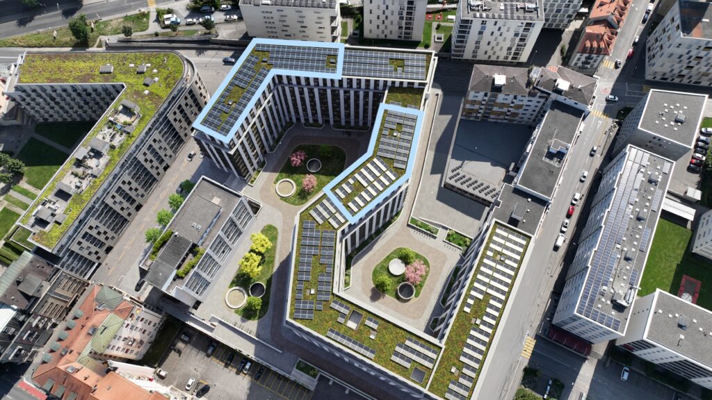 Le bâtiment est relié au chauffage à distance (CAD), alimenté par des sources 100 % renouvelables, garantissant une chaleur constante tout en réduisant l’empreinte carbone. La toiture est équipée de panneaux photovoltaïques produisant une partie de l’électricité consommée sur place (autoconsommation jusqu’à 70 %).